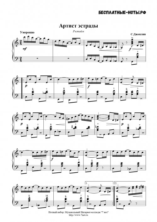 Ноты для фортепиано регтайм "Артист эстрады" - C. Джоплин